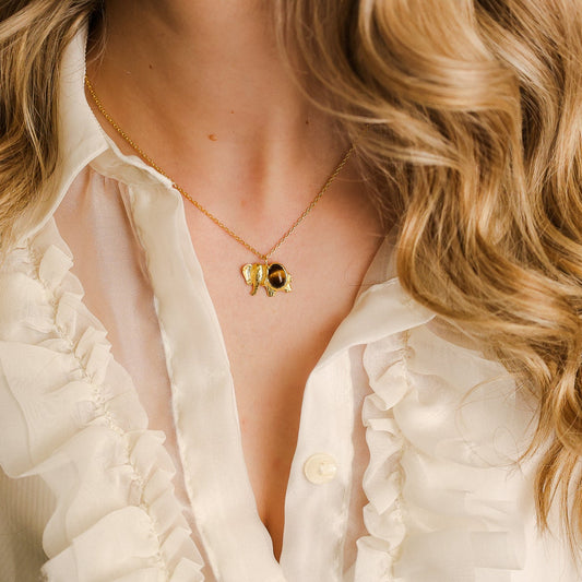 Fio Elefante em Prata Dourada com Pedra Olho de Tigre