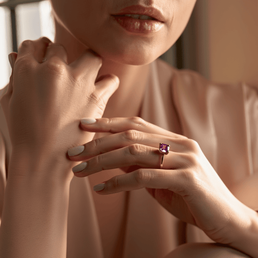 Anel em Ouro 19kl com Pedra Quadrada Roxa (T15)
