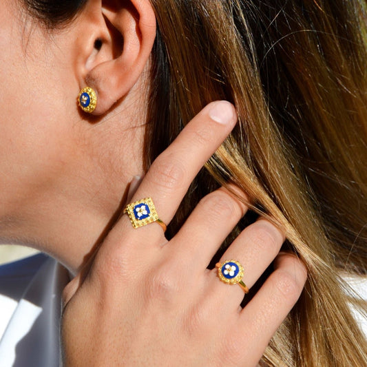 Anel Tradição Quadrado em Prata Dourada e Esmalte Azul