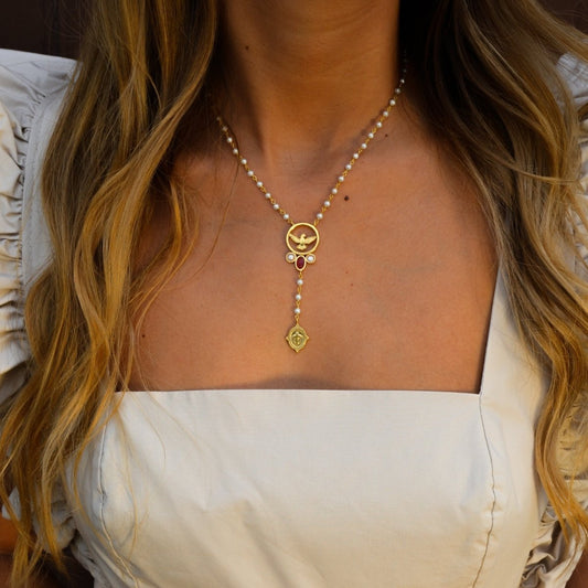 Fio Pomba em Prata Dourada com Perolas e Pedra Rosa