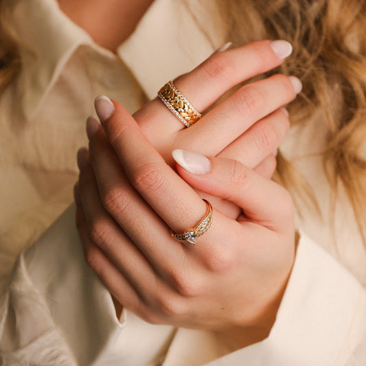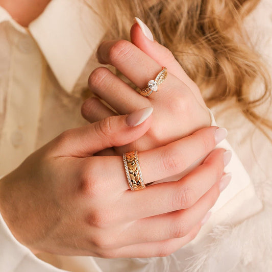 Anel Entrançado em Prata Dourada com Zircónia em Lágrima