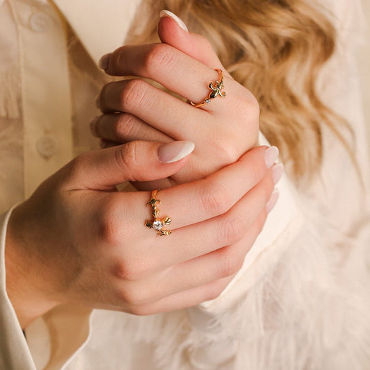 Anel em Prata Dourada com Folhas e Zircónias