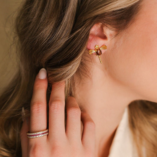 Brincos Abelha em Prata Dourada com Pedra Hidrotermal