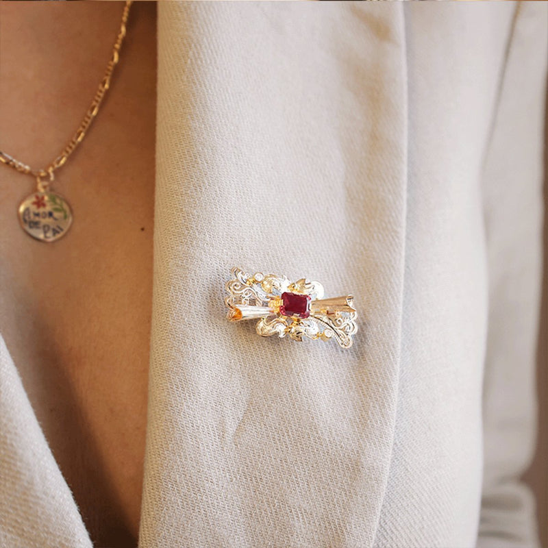 This brooch is not just a piece of jewelry, but an expression of art, combining classic design with high-quality gemstones. It's a charming choice for those who appreciate unique and timeless pieces, and would make an extraordinary gift for special occasions.