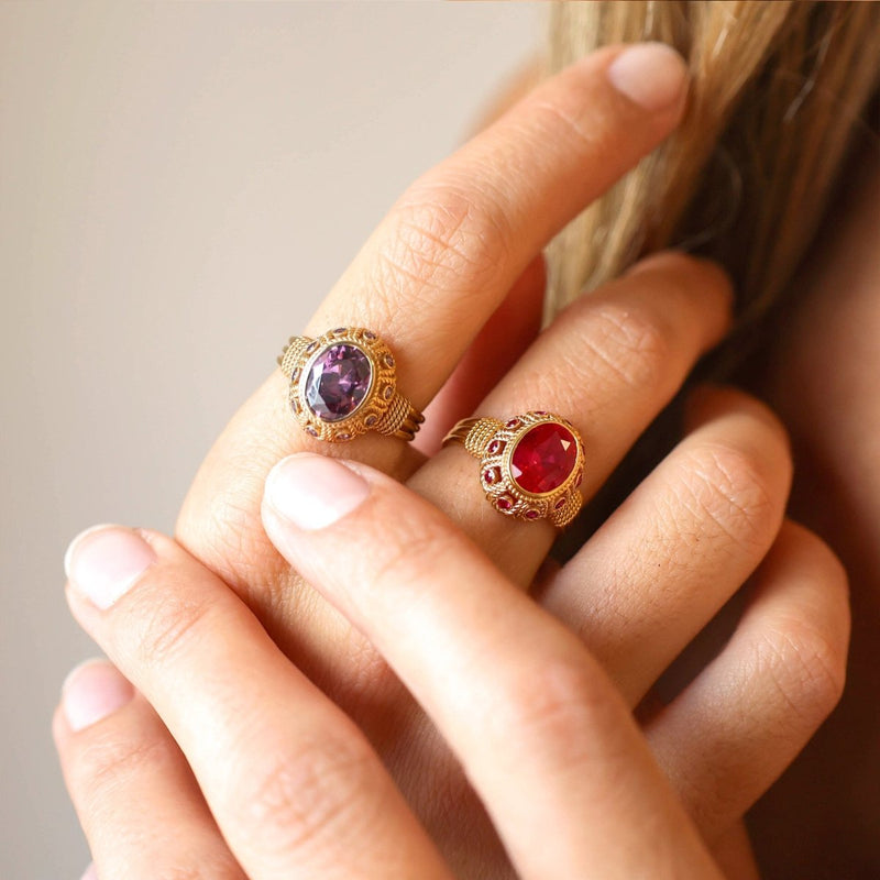The beauty of the purple stones and the intricate design that surrounds the ring make this piece of jewelry an expression of elegance and sophistication. Its intricate patterns add a touch of refinement and tradition to the piece.