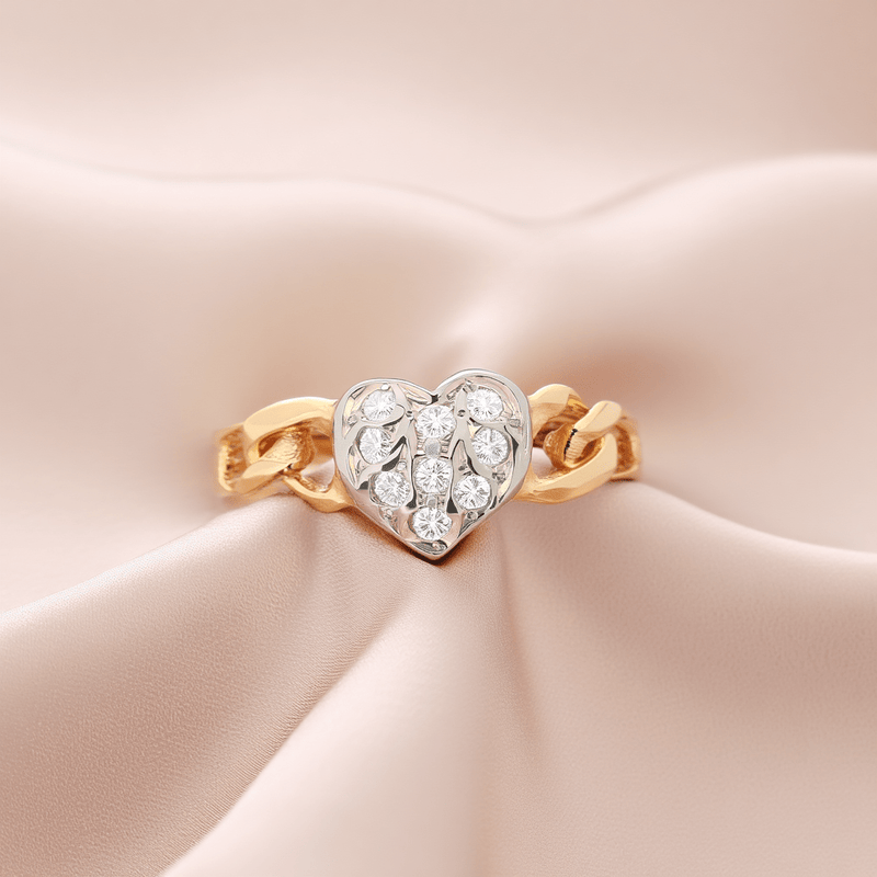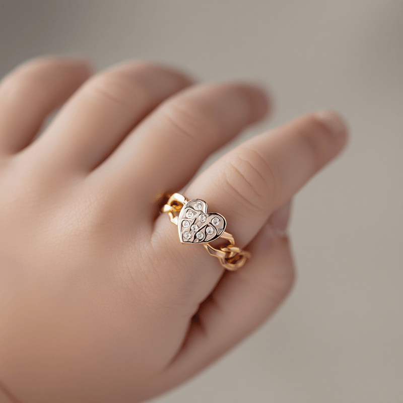 This delicate ring, designed especially for children, combines tenderness and sparkle in a charming design. The gold band features an elegant chain effect, symbolizing connection and protection, while the central heart, finely set with diamonds, captures the light with a soft, enchanting glow.