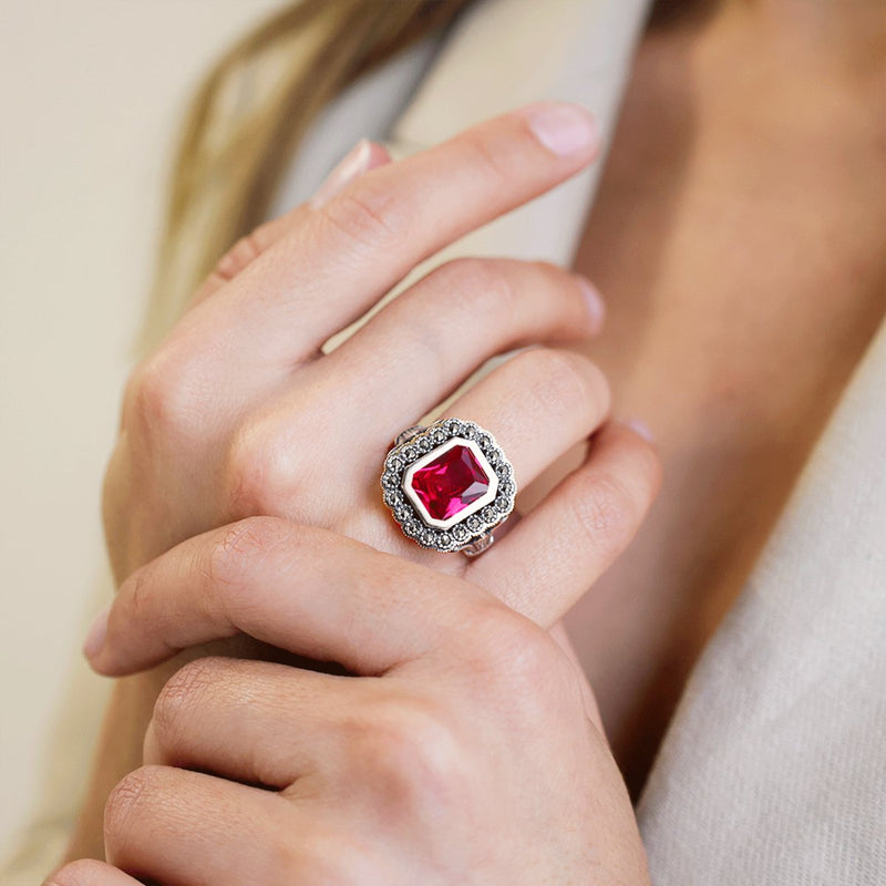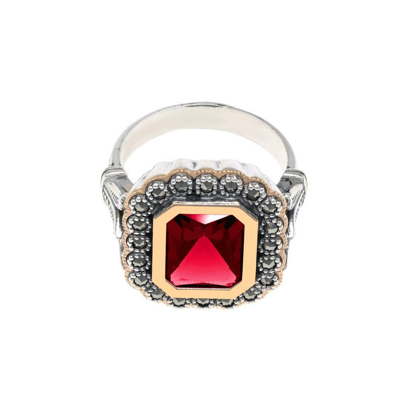 D. Constança Ring in 925 Silver adorned with Red Stone flanked by Marcasites and details in 9k Gold