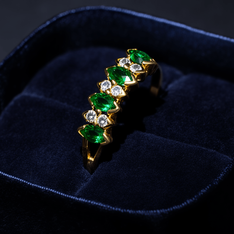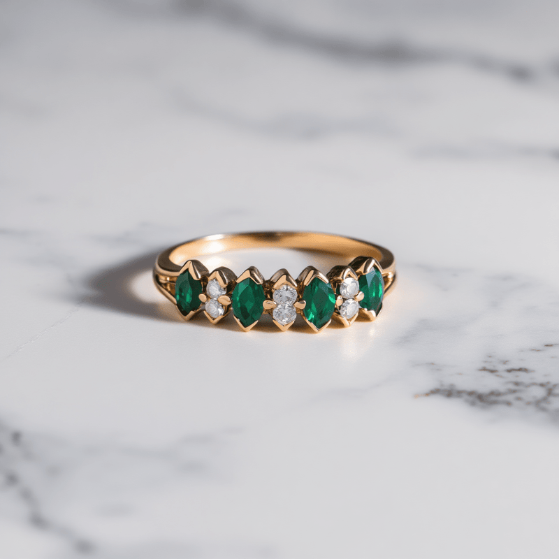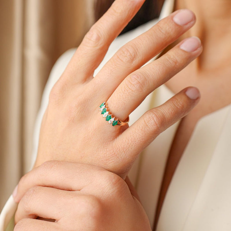 The 19-karat gold ring adorned with navette-cut zirconias and green stones is a stunning piece that combines elegance and sophistication with a timeless design.