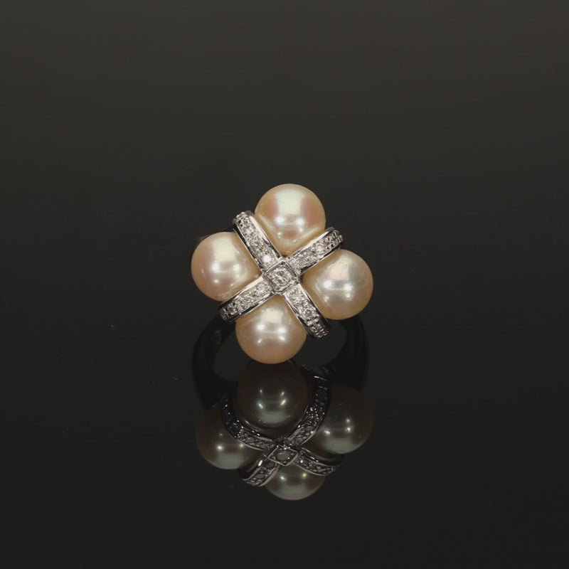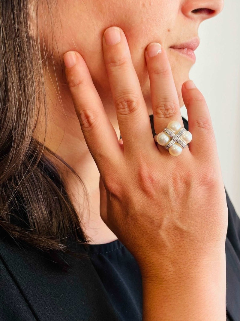 The diamonds provide a dazzling sparkle, elevating this ring to a work of art that shines in its own right. The pearls, known for their timelessness, bring a sense of grace and femininity to the design. This ring is a perfect choice for special occasions, adding a touch of glamour and refinement to the look. A true testament to luxury and good taste.