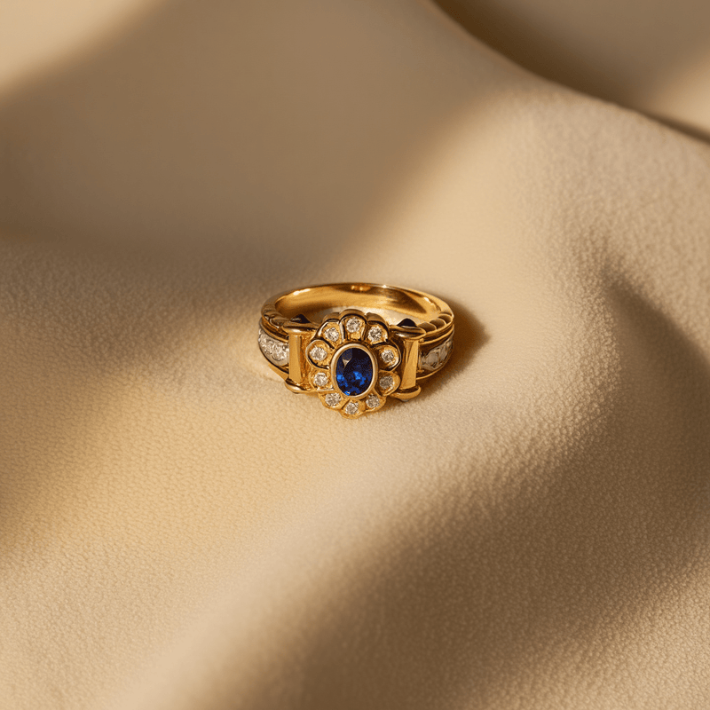 Whether as a centerpiece for special occasions or as a touch of luxury for everyday wear, this 19.2kt gold ring, adorned with sapphires and diamonds, is a sublime choice that transcends trends, remaining a classic and timeless jewel.
