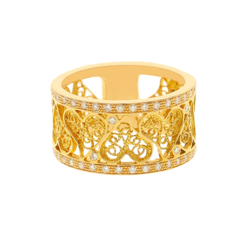 Anel Corações Rendilhados Filigrana em Ouro 19kl com Diamantes (T15)