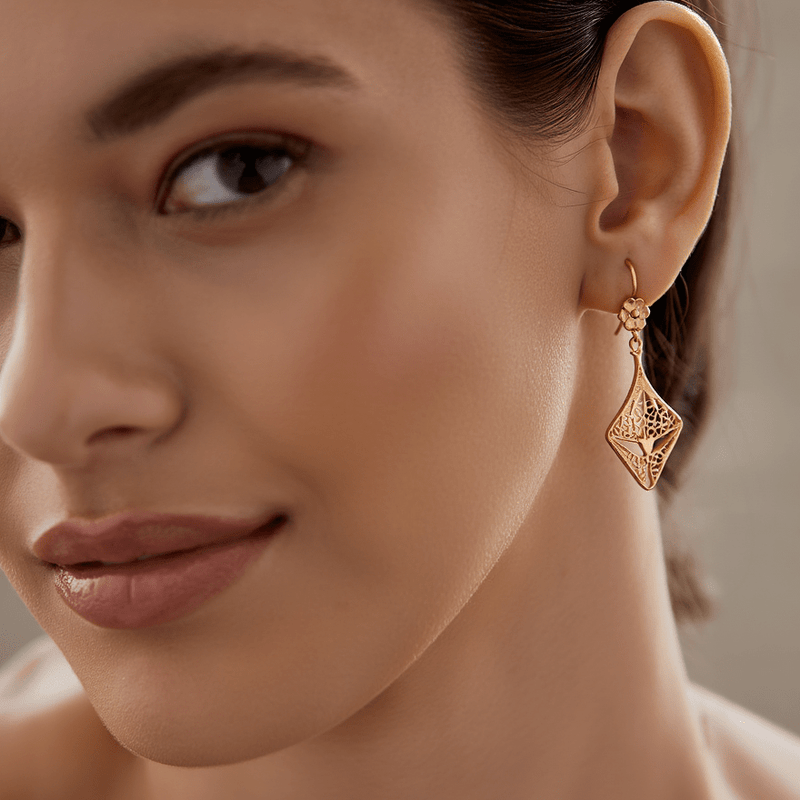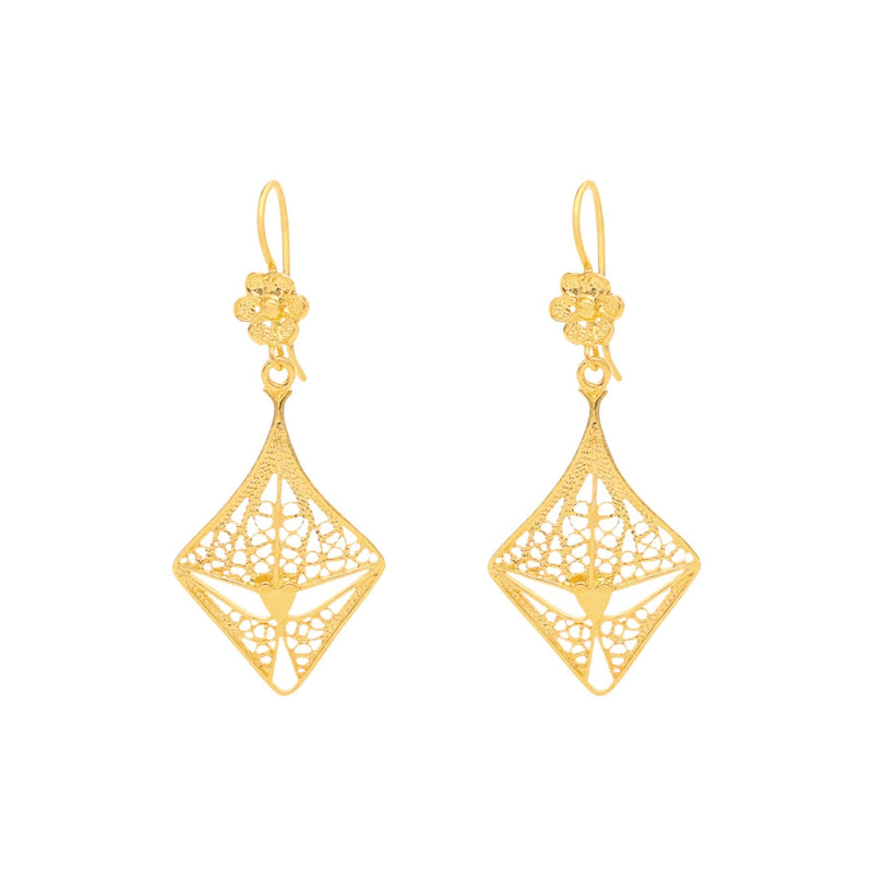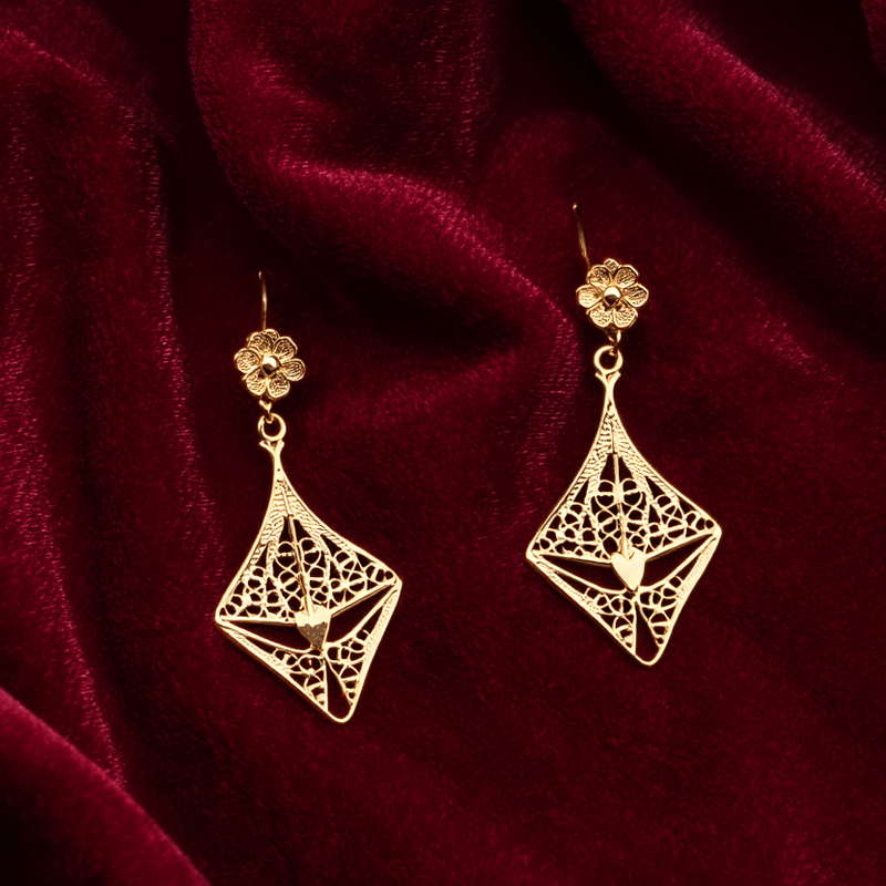 Romantic and meaningful, these gold-plated silver dangle earrings combine floral motifs and filigree details, showcasing the refinement of traditional goldsmithing. The carefully crafted central diamond houses a delicate heart, a symbol of love and protection.
