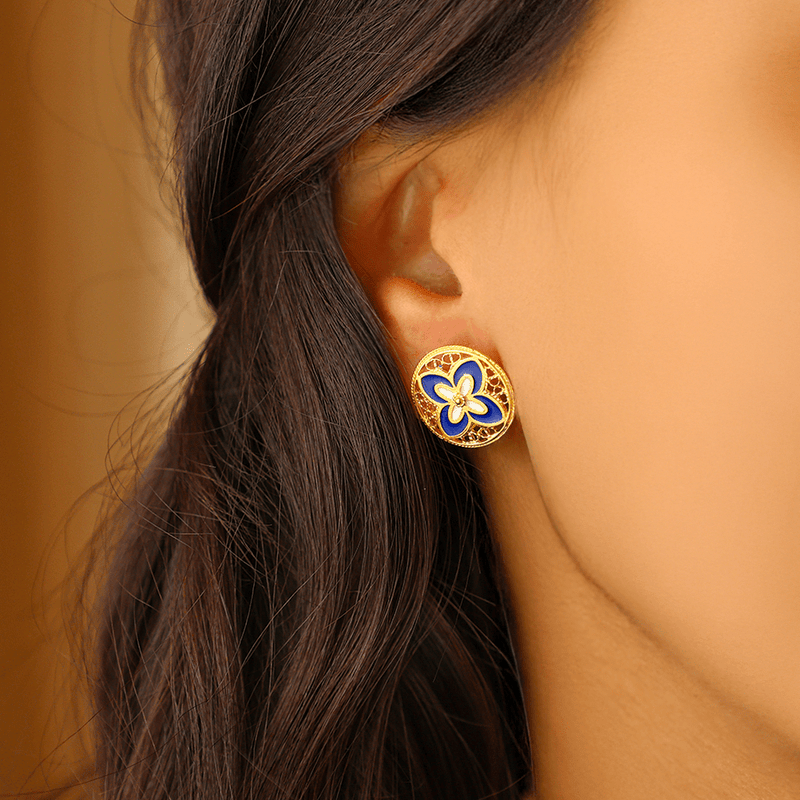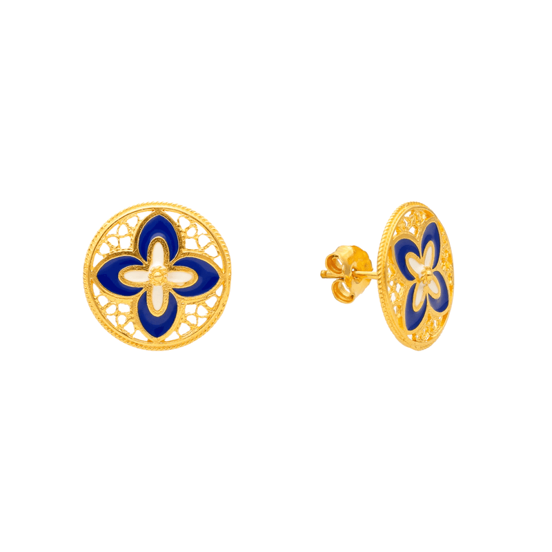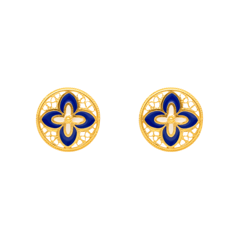 Brilho da Mouraria Earrings in Gold-Tone Silver with a Blue and White Enamel Flower – Inspired by Portuguese Tiles