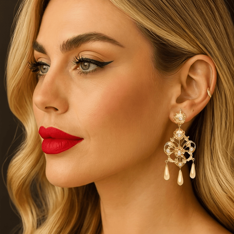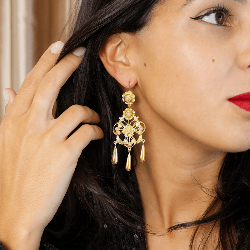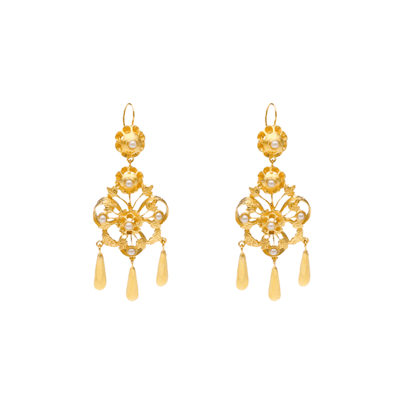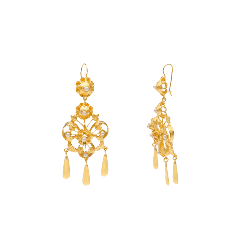 The Celestia Earrings in 925 Gold-Tone Silver are a celebration of the splendor and exclusivity of Portuguese jewelry. The earrings feature a rich gold tone and white pearls that lend the piece a timeless touch. Each earring is a tribute to luxury, meticulously crafted by artisans in Portugal, with details that capture the essence of sophistication. The bold design of the Celestia Earrings exudes confidence and, at the same time, delicacy with their floral motifs.