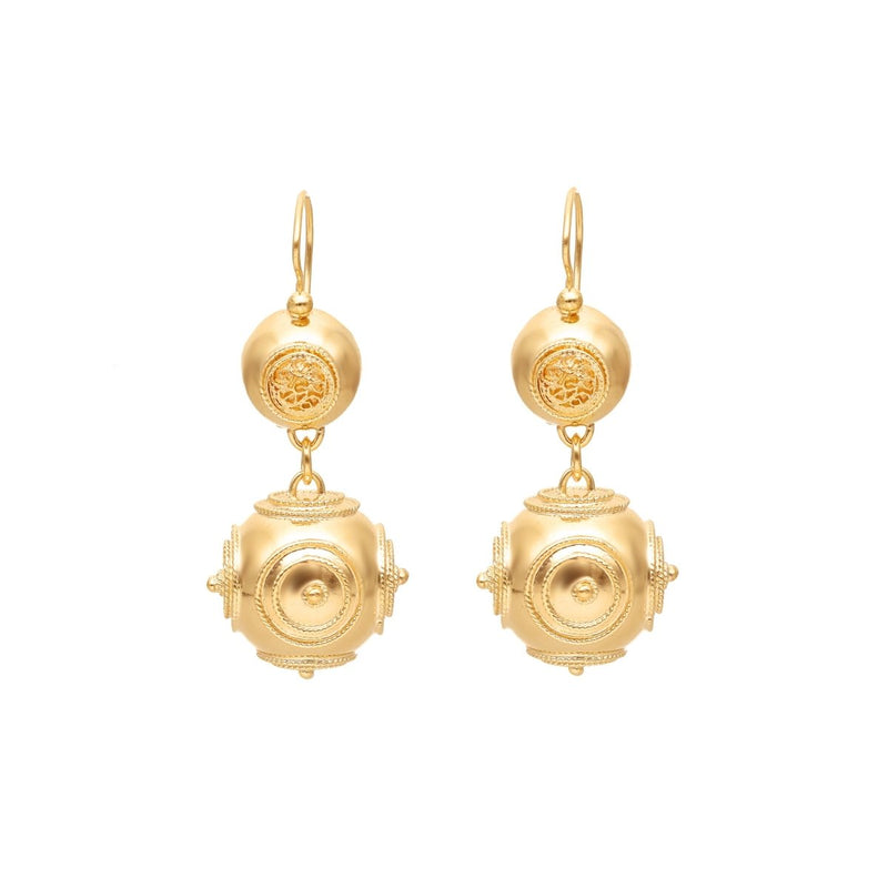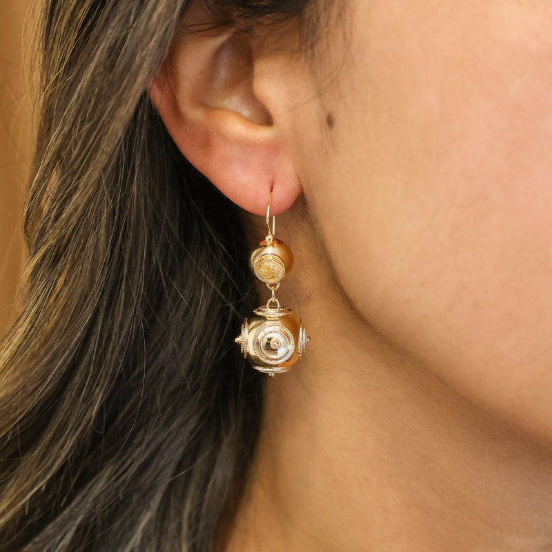 Duquesa Earrings in 19.2k Gold with Large Viana Bead and Half Ball with Filigree Work