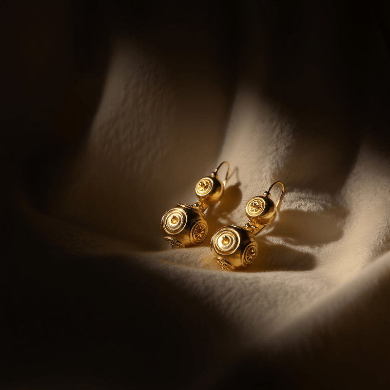 The 19.2kt gold Duchess earrings with large Viana beads and half-balls with filigree work are a masterpiece that combines the elegance of high-quality gold with the tradition of filigree and the charm of Viana beads. The 19.2kt gold gives the earrings a lasting shine and rich hue.
