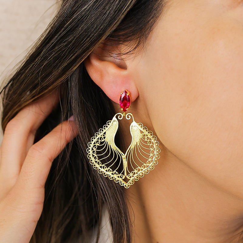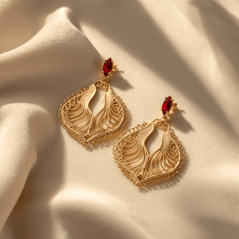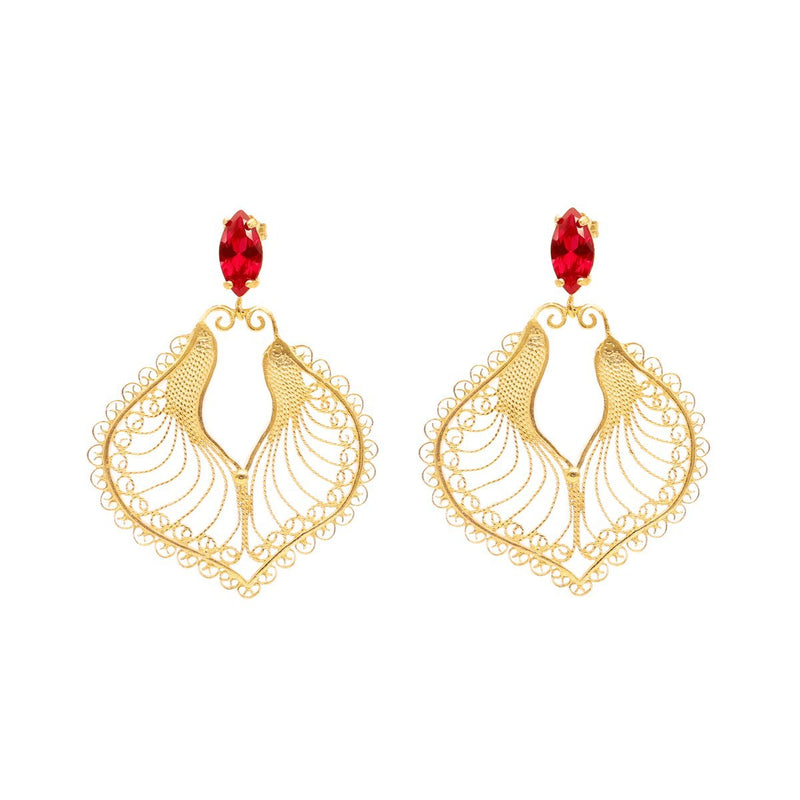 Harpa Earrings in 925 Gold Silver with Filigree work, and adorned with elegant Red Stone