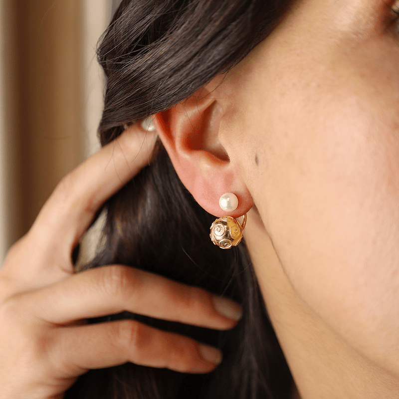 The Gold-Tone Silver Drop Earrings with Pearl and Viana Ball are a charming fusion of classic elegance and tradition. The gold-plated silver adds a contemporary touch, while the pearls and Viana Ball bring a timeless element to the piece.