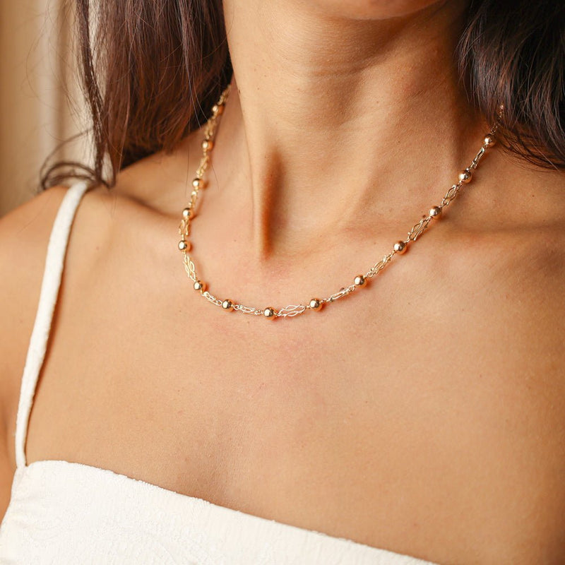 Crafted from high-quality materials with a polished finish, this necklace is perfect for enhancing your look with a contemporary and elegant touch. The interspersed spheres add texture and movement to the design, subtly reflecting light. Ideal for everyday wear or to complement a special look, this necklace is a versatile and timeless choice.