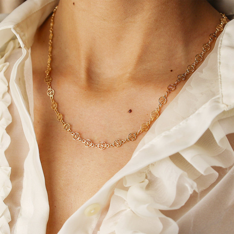This elegant gold necklace stands out for its sophisticated design, composed of links interspersed with circles , creating a unique and modern look. The harmonious combination of shapes gives the piece a touch of exclusivity, making it perfect for those seeking a refined accessory full of personality.