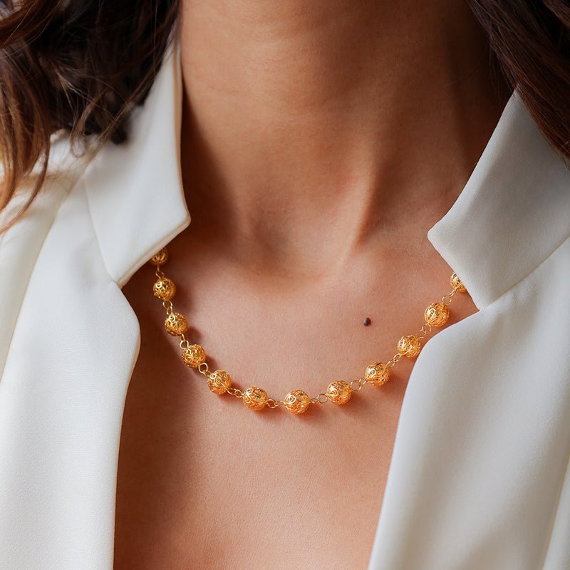 This 19.2-karat gold necklace is a true work of art, where filigree is the focal point. Filigree is a centuries-old artisanal technique that involves the careful manipulation of fine gold wires to create intricate and detailed patterns. On this necklace, the filigree-embellished beads are the focal point, adding texture and depth to the piece.