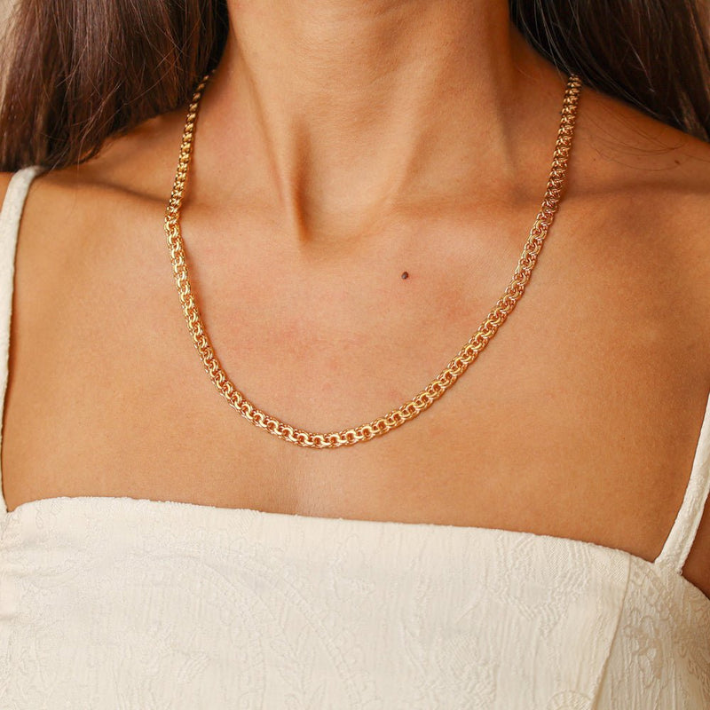 Este fio de ouro em malha friso grossa é ideal para quem procura um fio imponente e que dê nas vistas. Disponível em diferentes tamanhos e grossuras, a malha friso é intemporal e nunca sai de moda. Com os elos redondos interligados entre si, esta malha é ideal para qualquer ocasião.