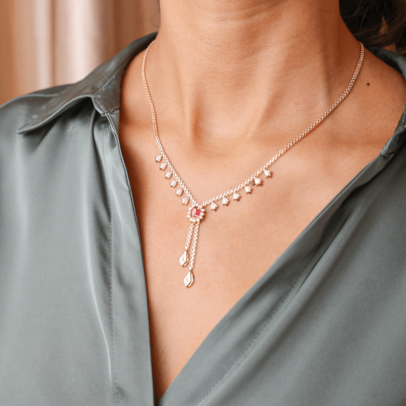 Esta deslumbrante gargantilha de ouro com rubi é uma joia única que combina tradição e modernidade com um toque de requinte absoluto. No centro, um rubi intenso é delicadamente ladeado por zircónias brilhantes, criando um contraste elegante e sofisticado. A partir do conjunto central, dois segmentos da malha estendem-se em forma de pendentes, terminando em delicadas lágrimas de ouro, conferindo movimento e graciosidade à peça.