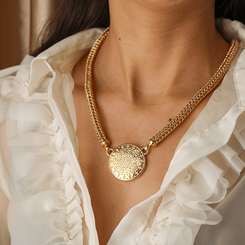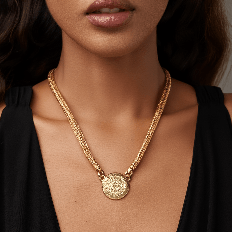 Ideal for those who value statement accessories, this wheat-blend cord with medallion can be worn alone for a sophisticated look or combined with other items for an even bolder style. Perfect for special occasions or for those who want a touch of refinement in everyday life.