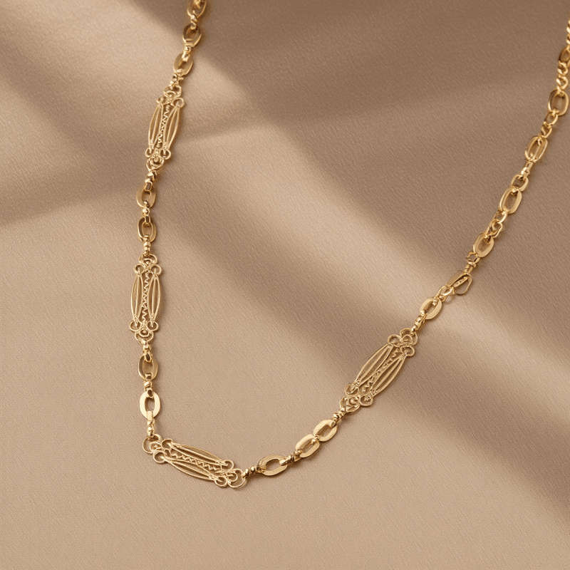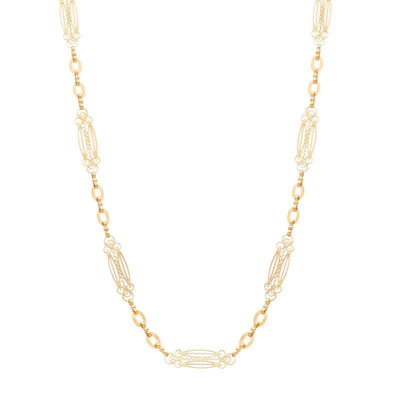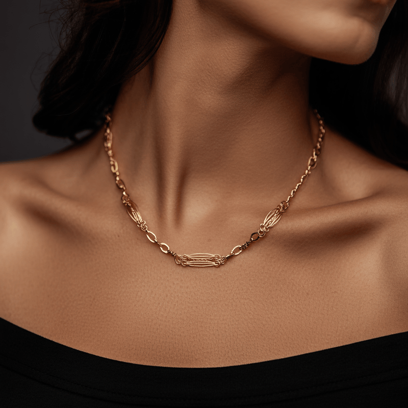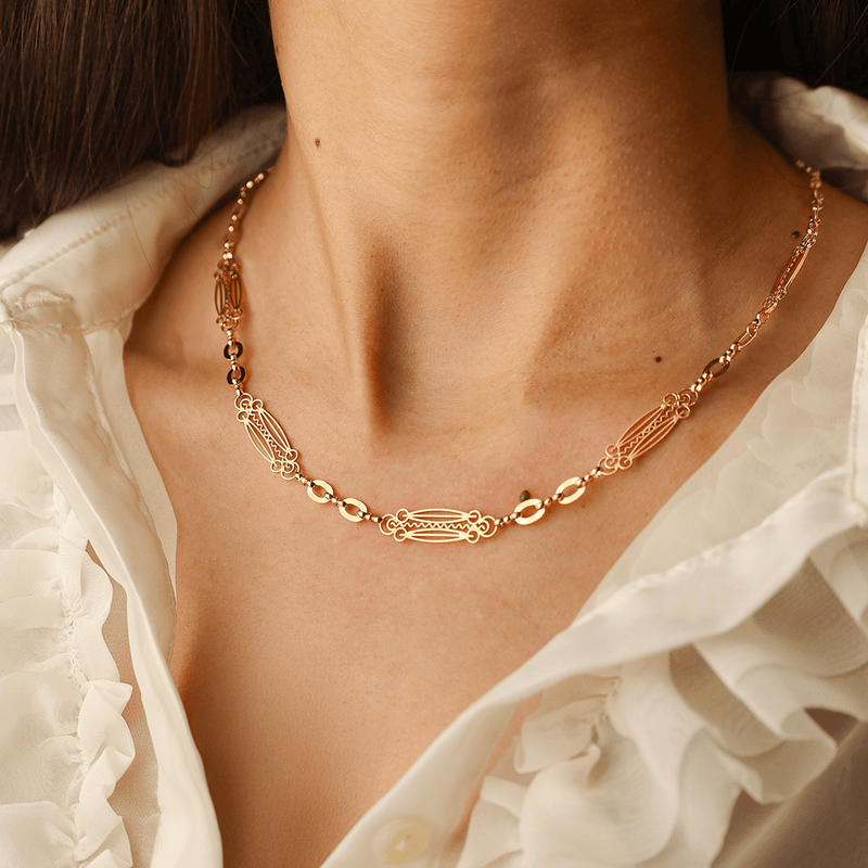 The stately gold choker is a jewel of rare beauty, marked by the meticulous and refined workmanship of its mesh. Its intricate designs create a luxurious ornamental effect, evoking the elegance and nobility of aristocratic jewelry. A piece that combines tradition and sophistication, perfect for those who appreciate the refinement of high jewelry.
