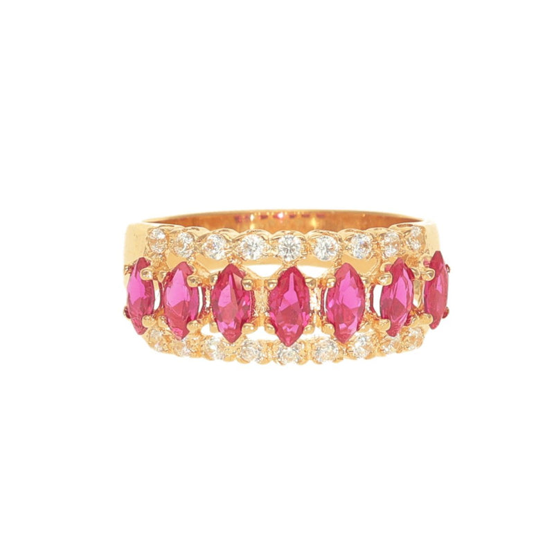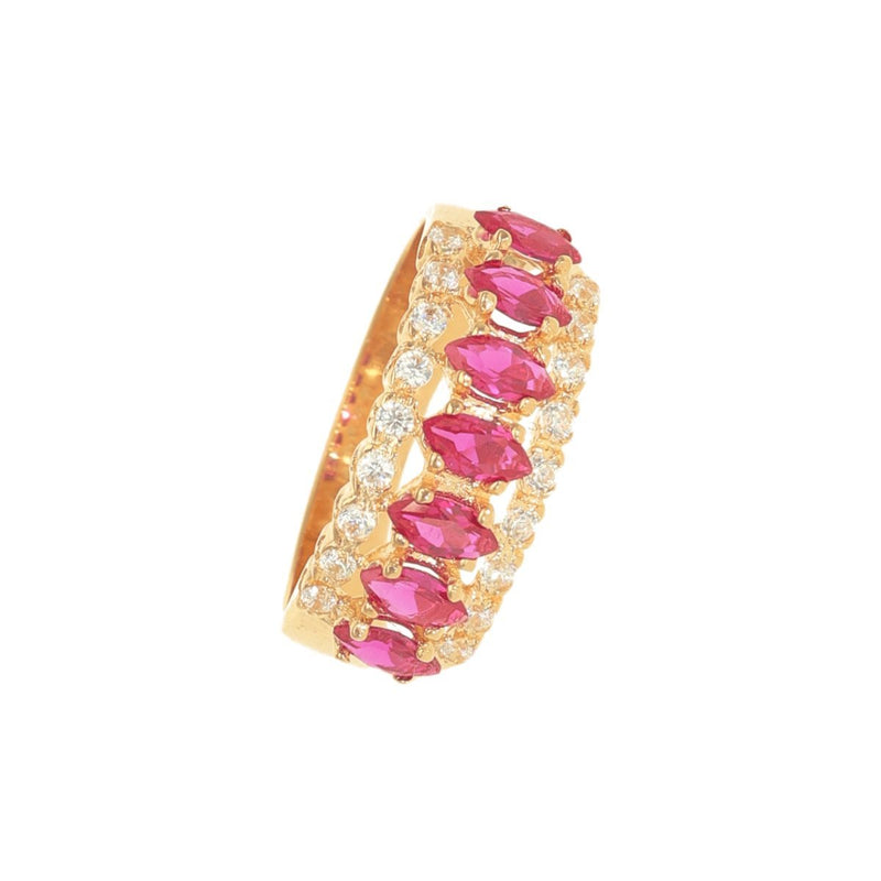 Anillo ancho en oro de 19,2kt adornado con elegantes rubíes de talla Navette flanqueados por circonitas.