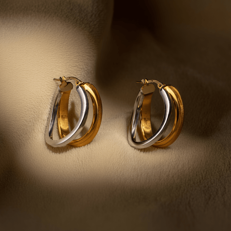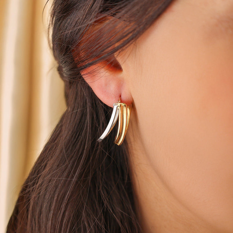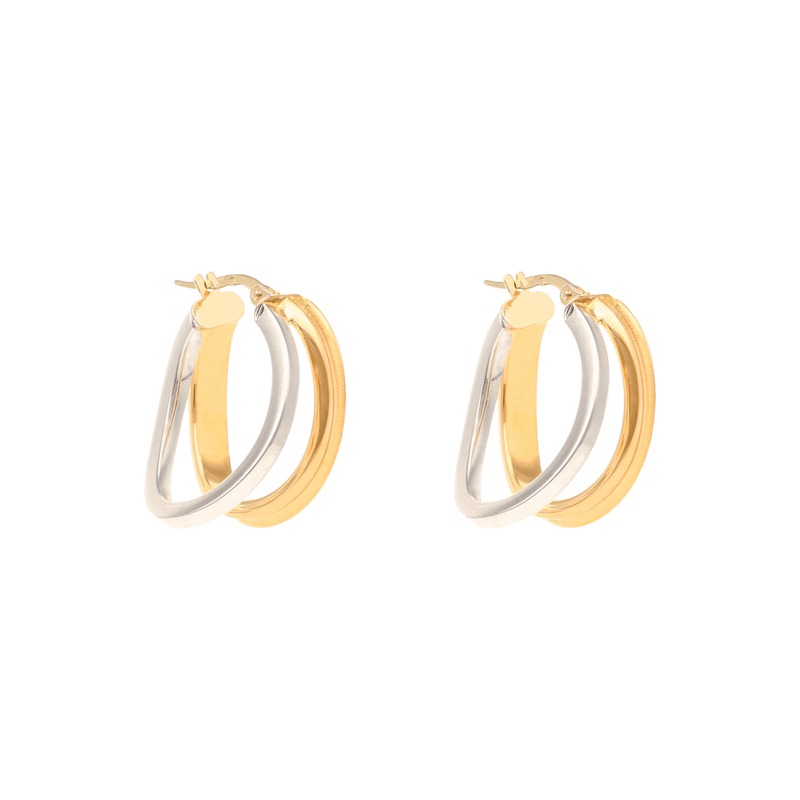 Perfectos para quienes buscan combinar tradición y modernidad, nuestros estilizados aros de oro bicolor destacan por su diseño único y atemporal. Elaborados con una delicada combinación de oro amarillo y blanco, crean un contraste sutil y sofisticado que realza cualquier look.