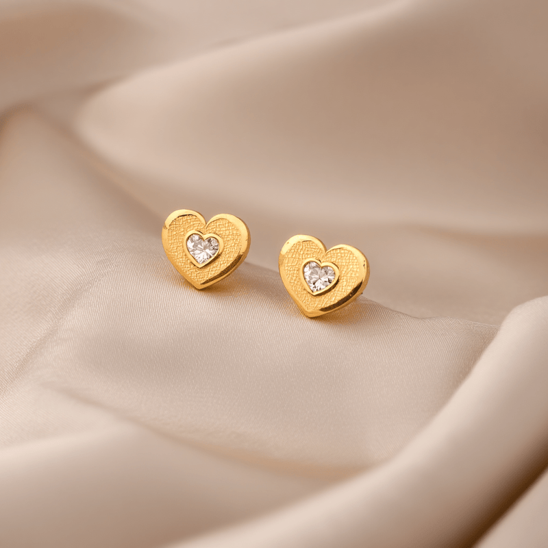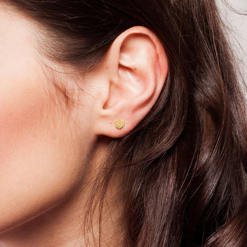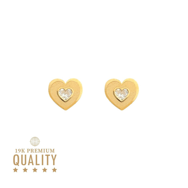 Pendientes de corazón en oro de 19k con efecto cepillado y adornados con elegantes circonitas en el centro.
