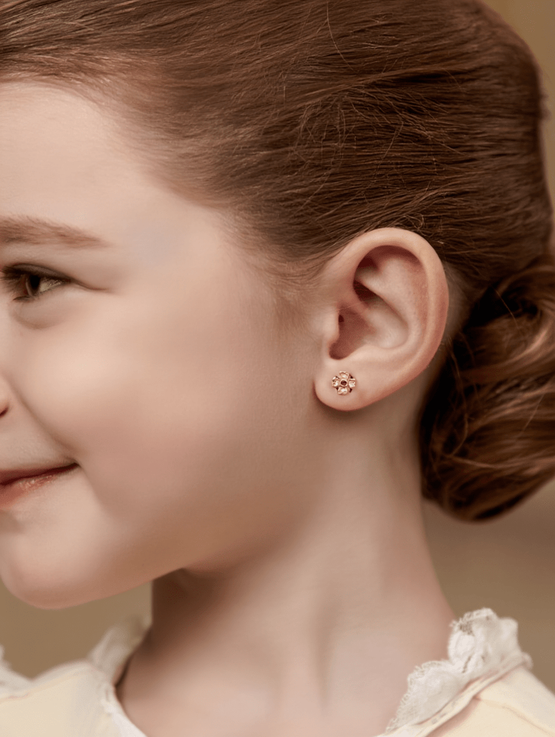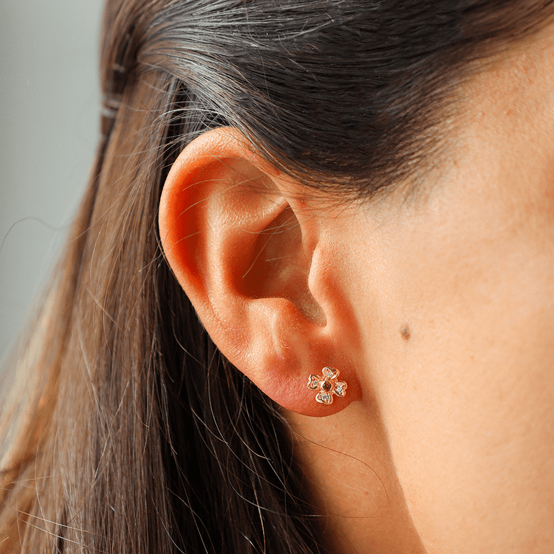 Pendientes en forma de flor de oro de 19k con rubí sintético y circonitas