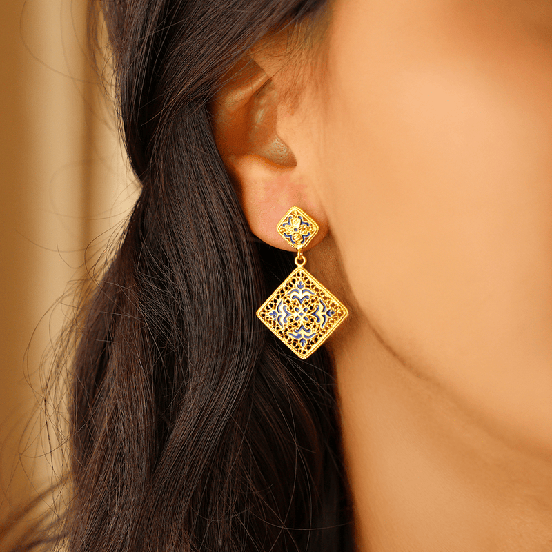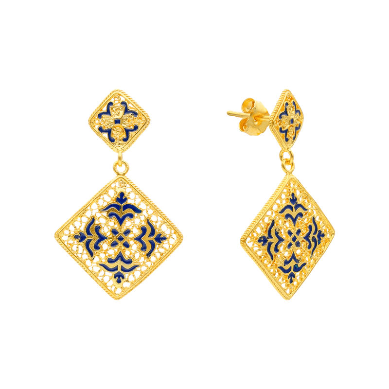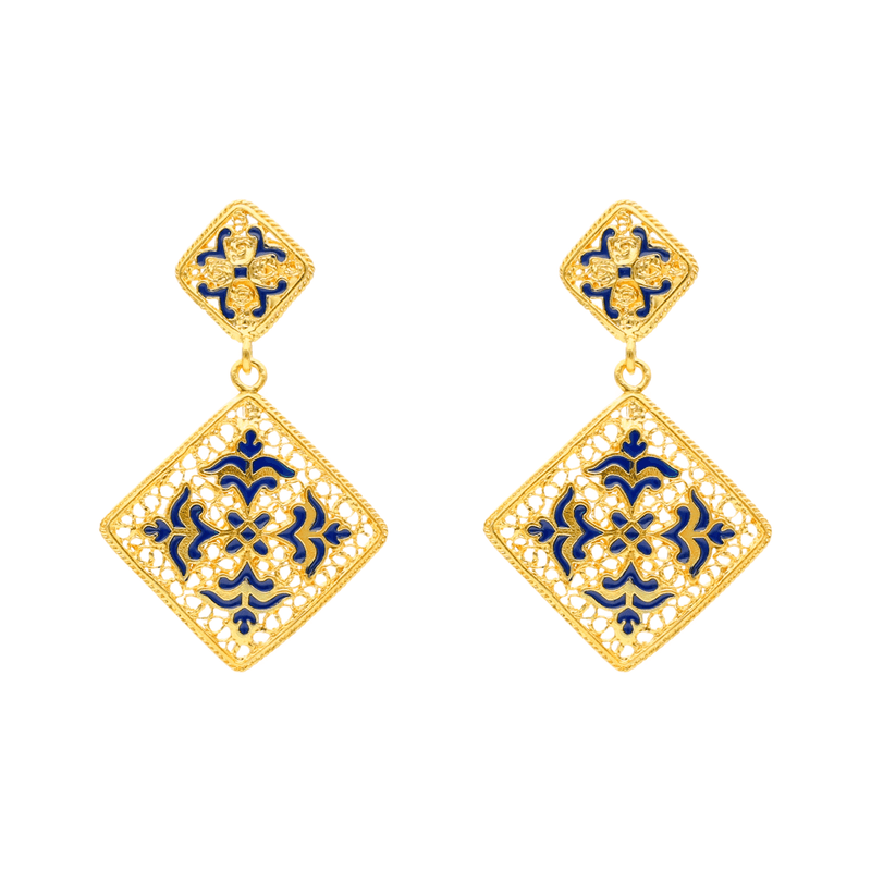 Pendientes Sonhos de Alfama en plata 925 bañada en oro con esmalte azul, inspirados en los azulejos portugueses.