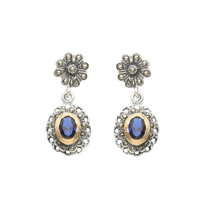 Pendientes vintage de plata 925 con motivos florales, adornados con piedra azul oscuro y marcasitas . Detalles en oro de 9 quilates.