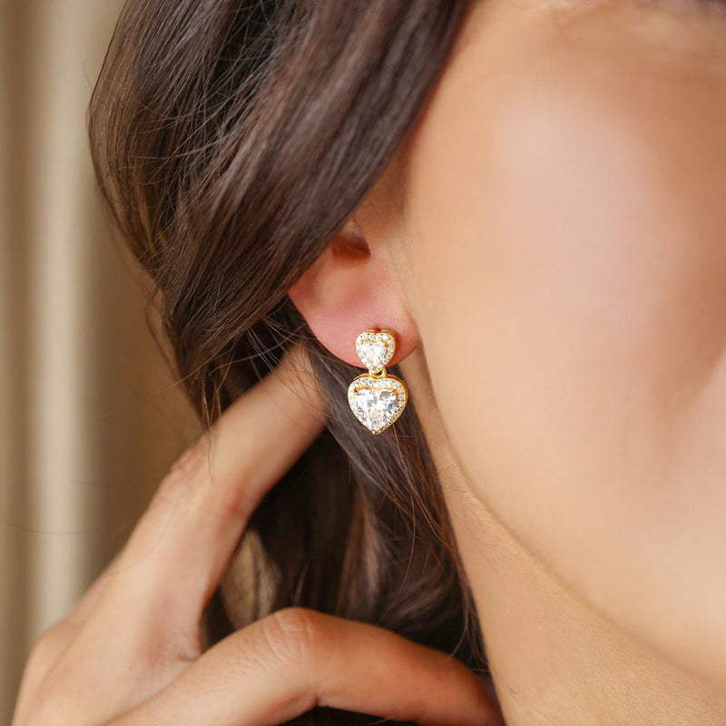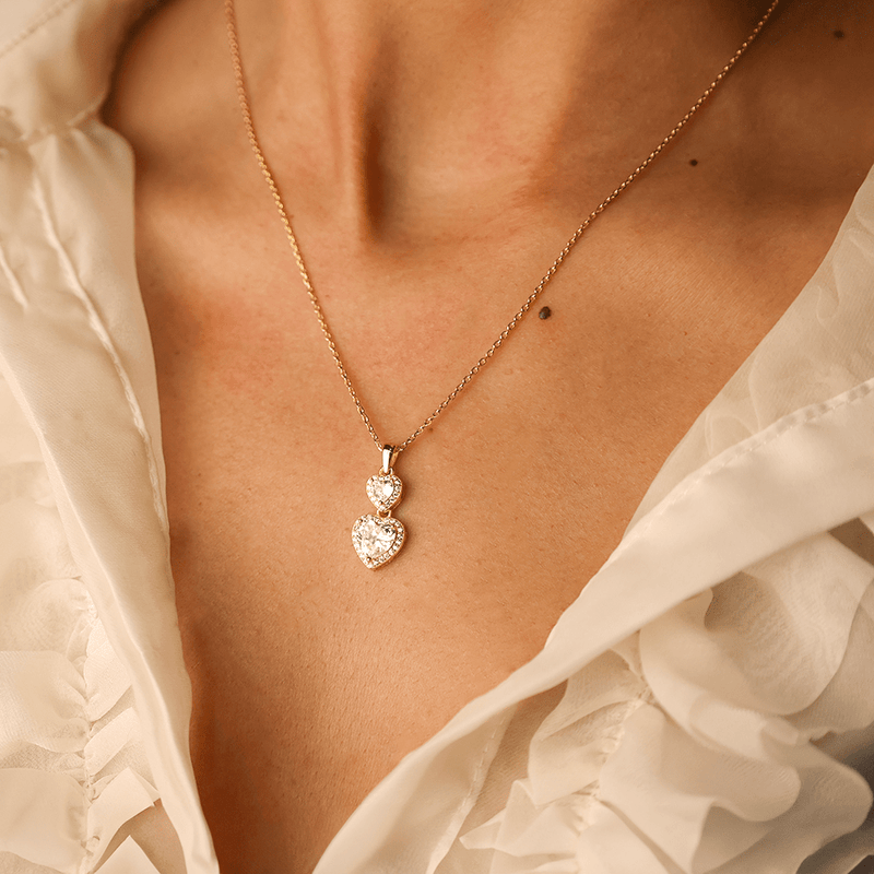 Conjunto de collar y pendientes de plata bañada en oro 925 con dos circonitas de corazón