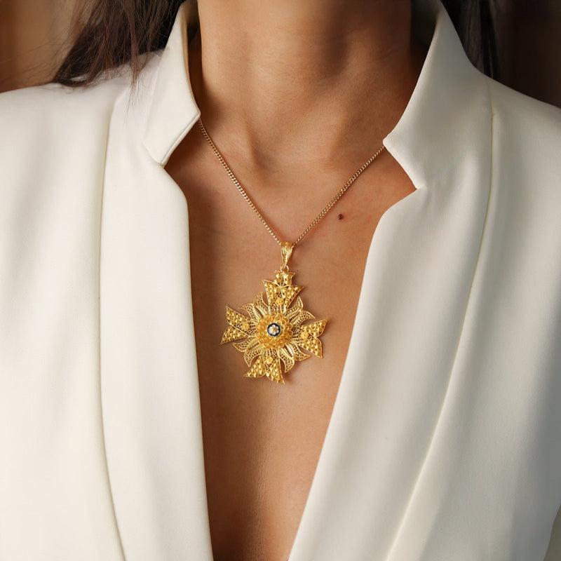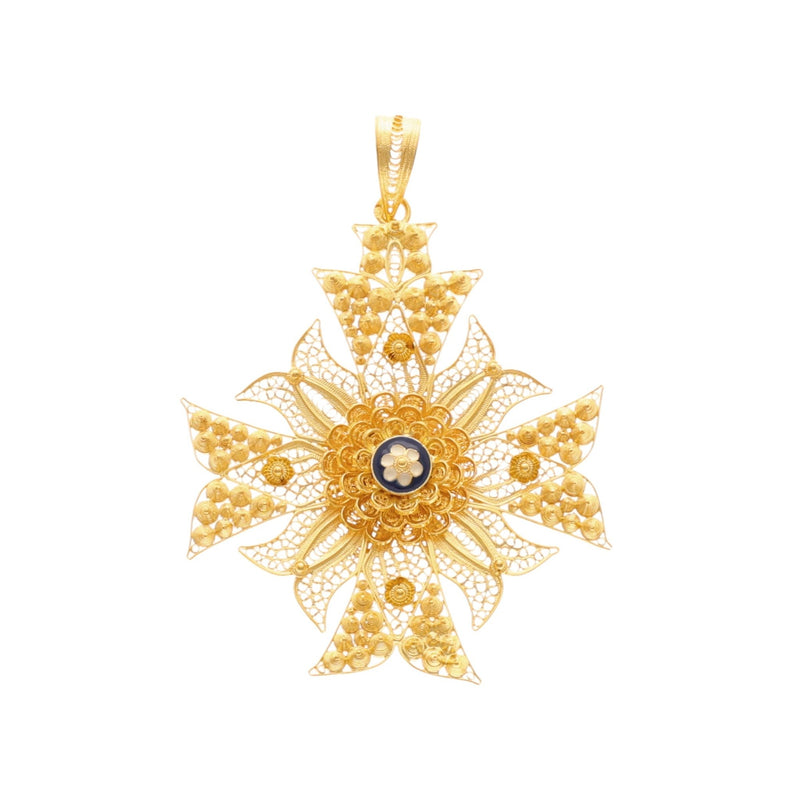 Cruz de Filigrana en Oro de 19k con Caracoles y Esmalte Azul