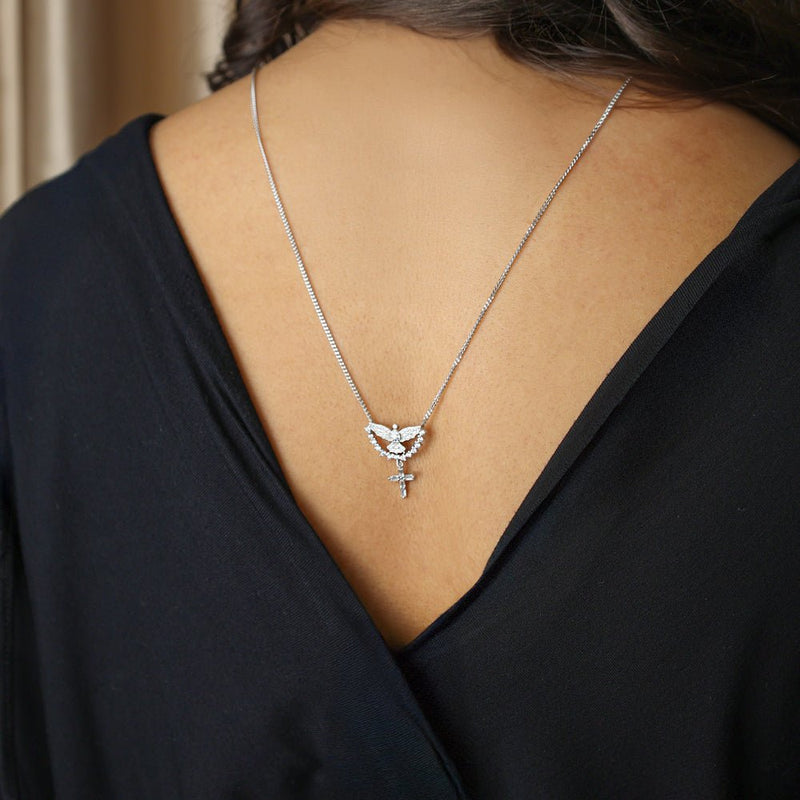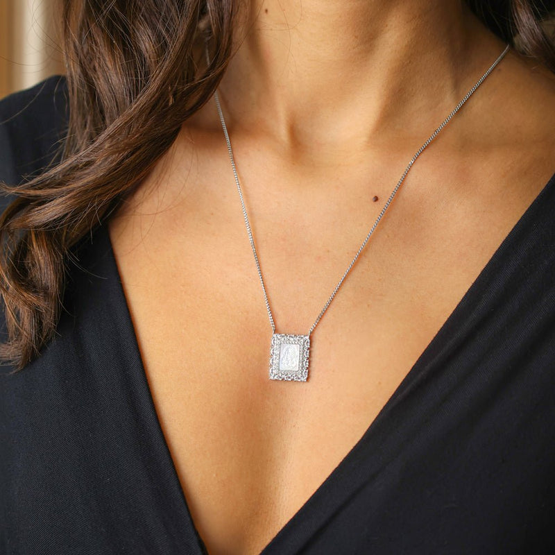 Este escapulario de plata es un poderoso símbolo de devoción y protección espiritual. La imagen religiosa de nácar refleja la luz de la fe, mientras que la paloma representa al Espíritu Santo y la paz divina, trayendo consigo la presencia de la protección celestial. La cruz, símbolo supremo del amor y la redención, completa esta joya sagrada, reforzando la conexión con lo sagrado.