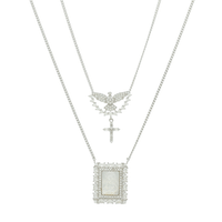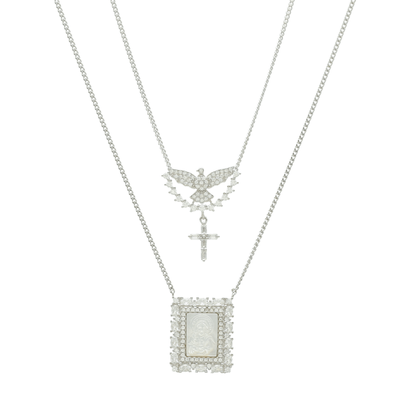 Escapulario en Plata 925 con Imagen Religiosa en Nácar adornada con Circonitas con Paloma y cruz