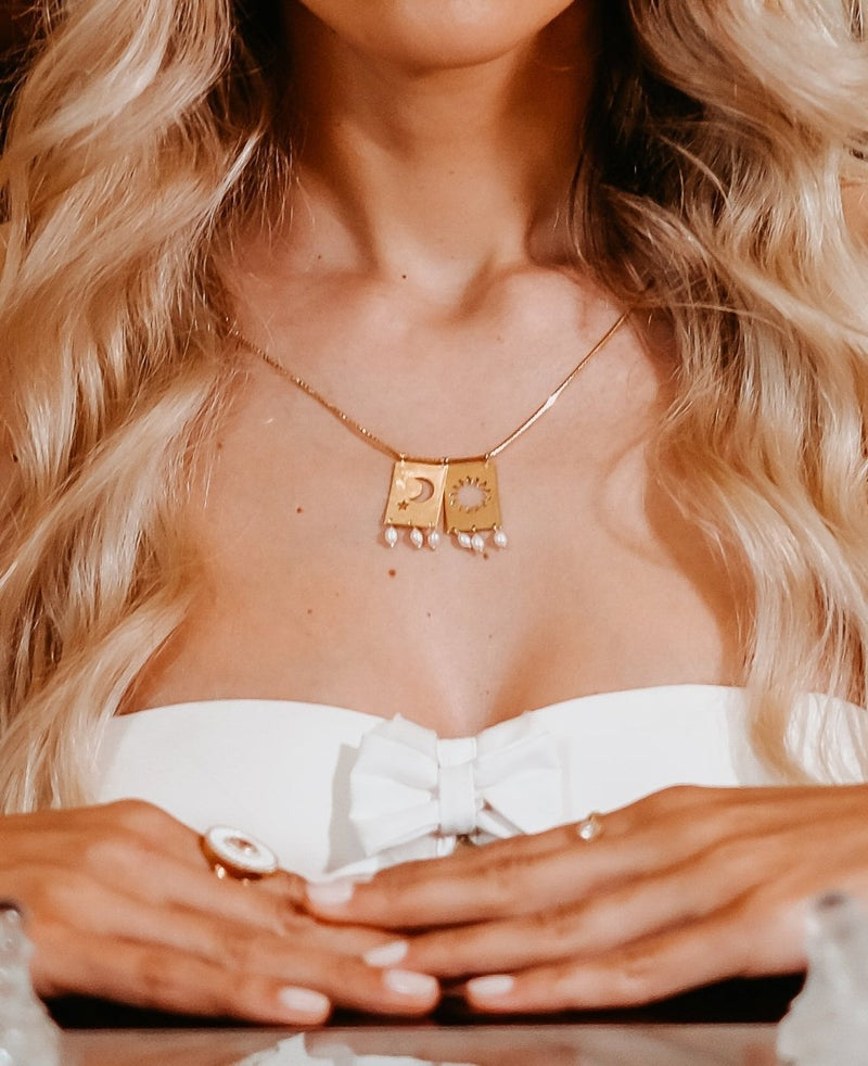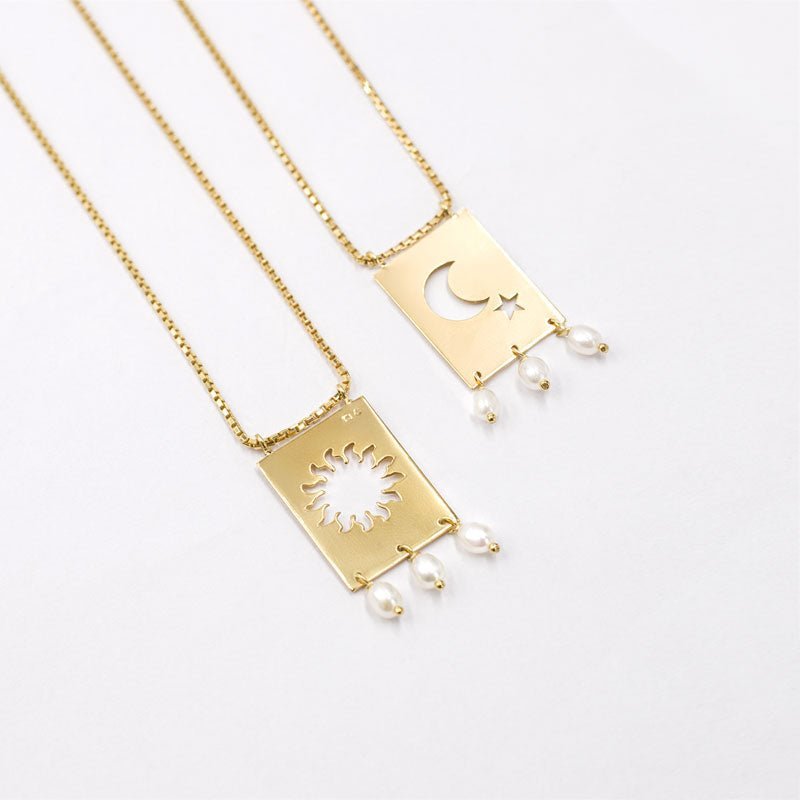 Escapulario en Plata 925, bañado en Oro de 18k, con Medalla Luna y Medalla Sol decoradas con Perlas Barrocas