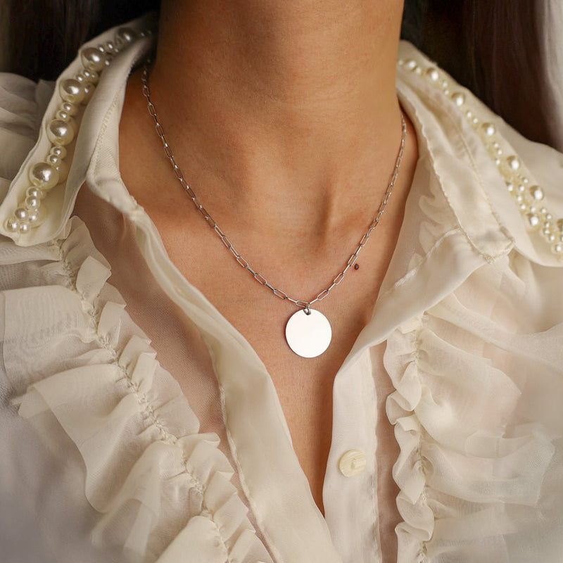 Descubre nuestra elegante Cadena de Plata Personalizable con Medallón Redondo, una pieza versátil y sofisticada. Este collar es perfecto para quienes buscan un regalo único o desean llevar un mensaje grabado especial.