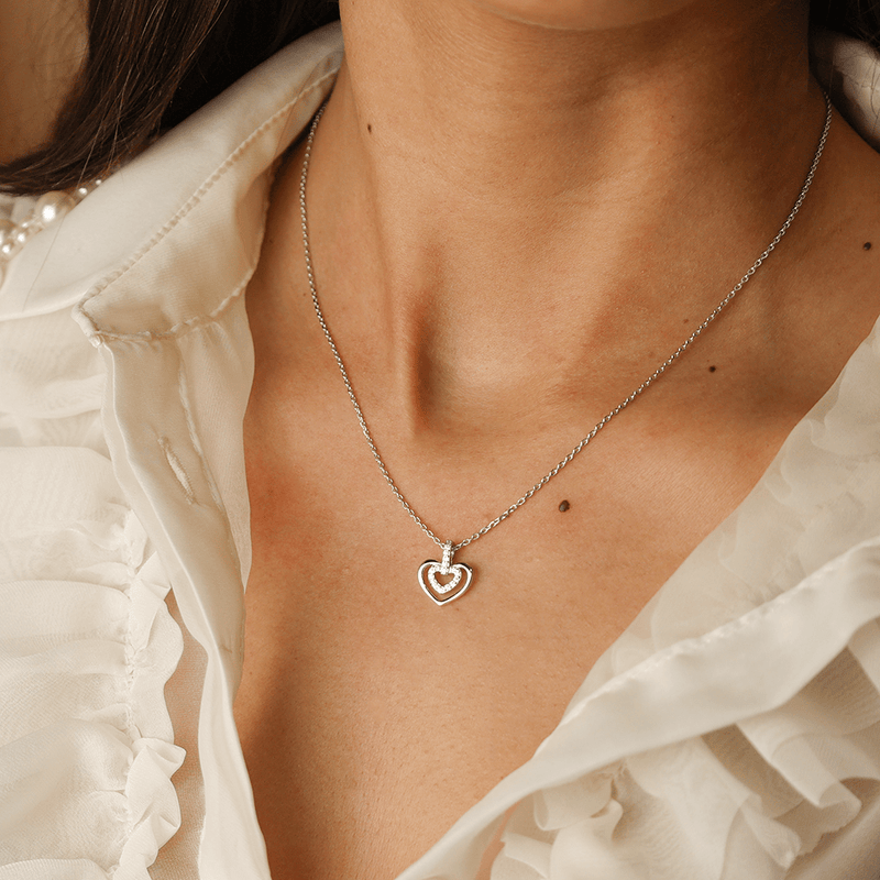 Este delicado collar de plata celebra la unión de los sentimientos más puros con un diseño encantador. El corazón exterior simboliza protección y cariño, mientras que el interior, adornado con brillantes circonitas cúbicas, representa la intensidad y el brillo del amor verdadero.