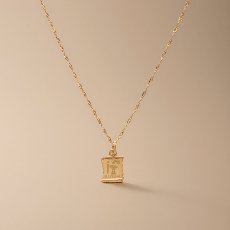 La Medalla de Bautismo, pieza central de este collar, es más que un adorno; es un símbolo de iniciación espiritual. Rica en detalles y significado, evoca la profundidad del compromiso espiritual que se celebra en el bautismo.