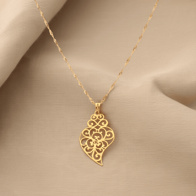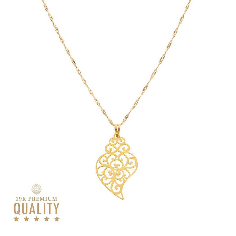 El Hilo de Malla Singapur en Oro 19k, adornado con la Medalla Corazón de Viana, es una sublime combinación de elegancia y tradición.