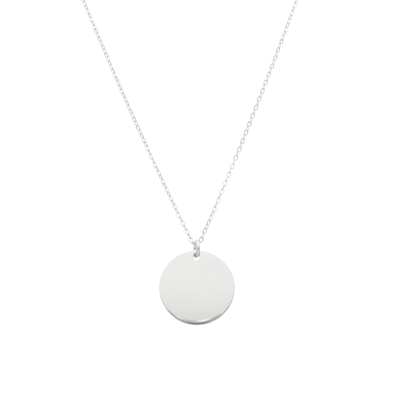 Cadena de plata con medalla redonda, personalizable con nombre o fecha.