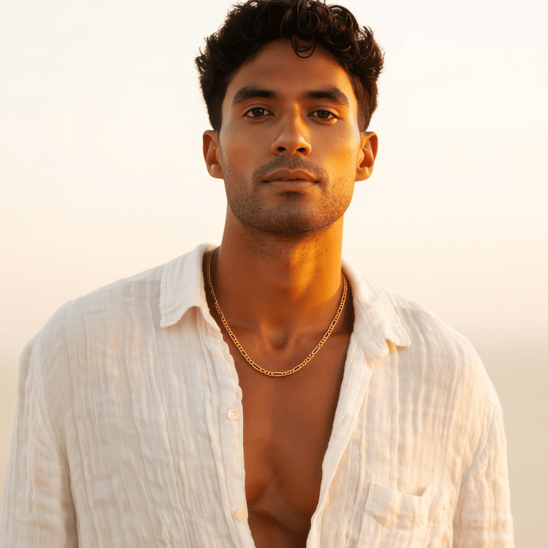 La fina malla le da a la cadena ligereza y sofisticación, mientras que el oro de alta calidad le aporta un toque de brillo y durabilidad. Esta versatilidad permite que la cadena sea un elegante accesorio por sí sola o una encantadora base para una medalla con un significado personal.