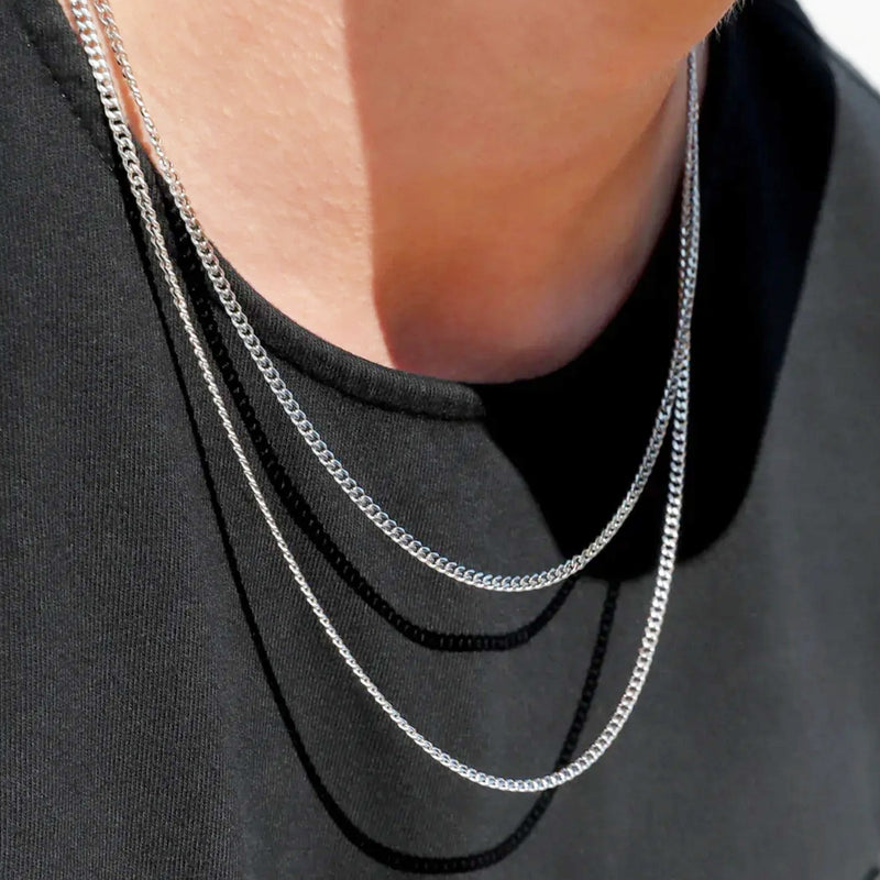 Este collar de plata presenta el clásico tejido de barbos, ofreciendo un diseño tradicional con un atractivo masculino contemporáneo. La robusta estructura del tejido de barbos le proporciona una textura distintiva y un brillo sutil, creando una pieza versátil, ideal para el día a día o para ocasiones más formales.