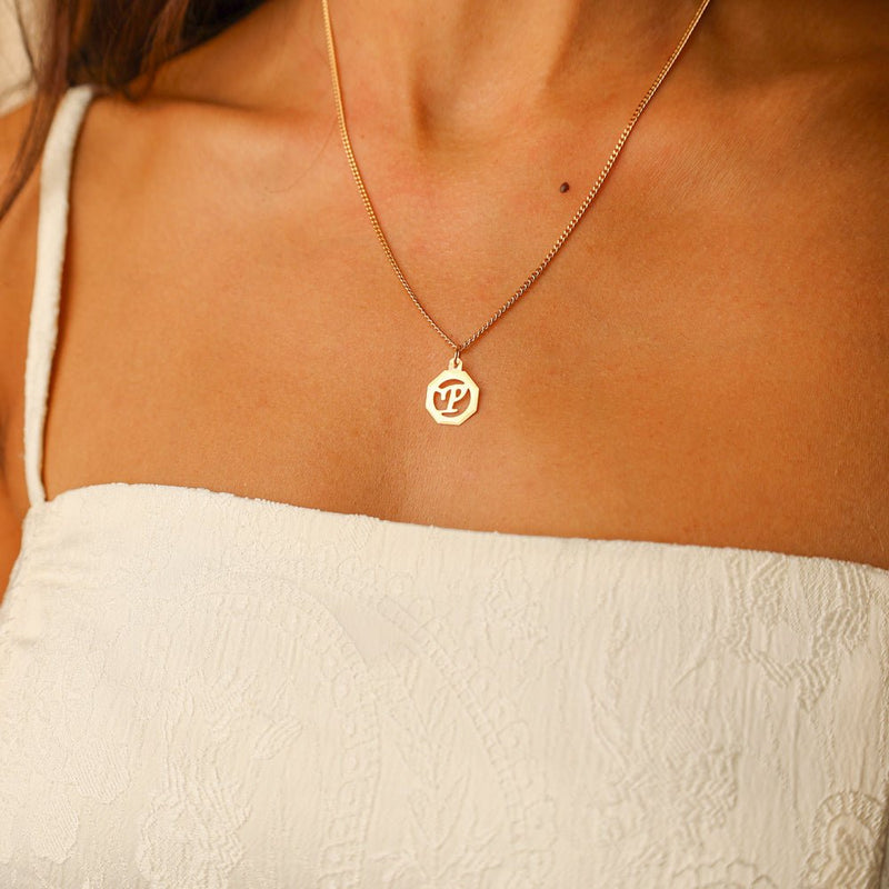 Medalla con la letra "P" en oro de 19 k (1,2 cm) – Forma hexagonal con diseño contemporáneo