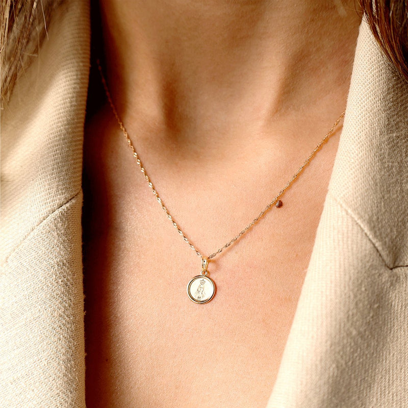 La Medalla Redonda de Oro de 19 quilates, cuidadosamente grabada con la imagen de Nuestra Señora, es una pieza de joyería que trasciende su valor estético y se convierte en una expresión de devoción y espiritualidad. El delicado grabado resalta los detalles de la imagen, creando una pieza única y significativa.