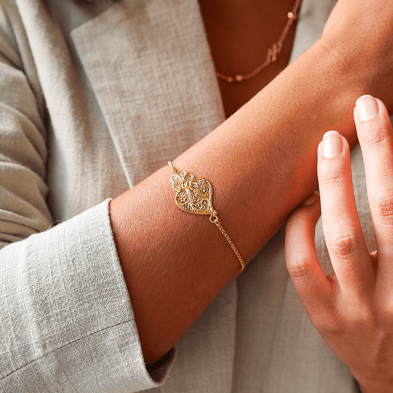 El diseño del Corazón de Viana, un famoso símbolo del norte de Portugal, está elaborado meticulosamente en plata bañada en oro, ofreciendo el lujoso brillo del oro con la calidad de la plata 925. Esta pulsera combina el encanto de la joyería tradicional portuguesa con un acabado moderno, lo que la hace versátil para el día a día o para ocasiones especiales.